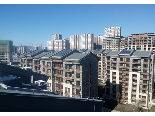 采用太阳能集中集热分户换热系统,太阳能集热器集中安装在坡屋面上,控制系统安装在水箱间内,每户一台60L太阳能换热水箱、并带有辅助电加热,由太阳能集中集热并通过传热介质给每户水箱加热,同时电加热与太阳能互补,满足用户的热水需求。