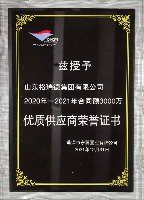 2019年12月,格瑞德集团与菏泽市东翼置业有限公司签订了关于东翼国际人防工程的第一份合同,尽管合同金额较小,但格瑞德集团认真对待,凭借优质的产品和优良的服务,赢得了客户的信赖,并相继承建东翼国际其他地块的人防工程,并荣获菏泽市东翼置业有限公司“2020年-2021年合同额3000万优质供应商”。