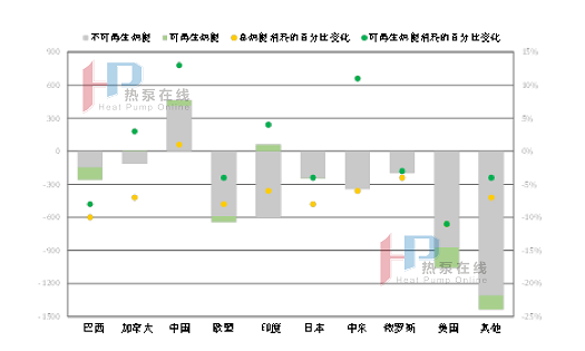 据国际能源署(IEA)统计数据,图3-8给出了7个国家或地区工业用热量同比变化,受疫情影响,除中国外其他国家或地区2020年的工业热能消耗较之于2019年有不同幅度的降低;而中国经济复苏表现强劲,工业用不可再生热能以及可再生热能消耗量分别提高了412×106GJ、50×106GJ,同比增长1%及13%。根据该数据估计,2020年中国工业用可再生热量仅占工业用总热能消耗的0.83%。显然,碳中和目标的达成过程中的可再生热量的比例远远不足,必须对高耗能行业的工艺流程进行根本性的改变。工业转型最前沿的脱碳选择是:通过提高工艺效率和新工艺来减少最终能源消耗,余热回收以及使用可再生能源代替化石能源。这里,热泵技术能够作为工业部门碳中和的解决方案之一,为我国工业部门减少二氧化碳排放提供一条可行的路径。