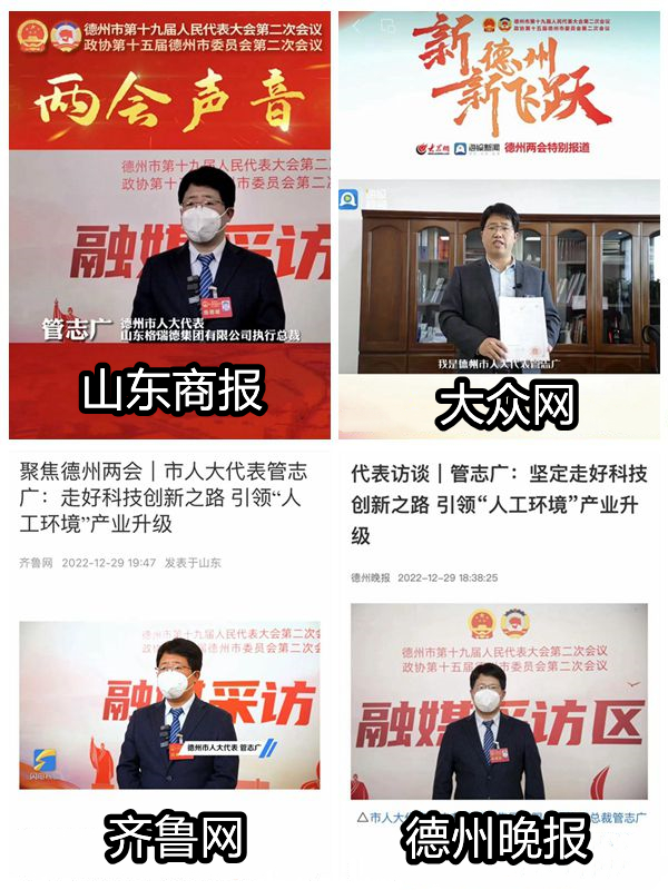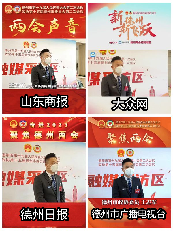 集团执行总裁管志广、总经理王志军在大会期间积极建言,代表德州企业出谋划策,受到多家媒体的关注。齐鲁网、大众网、山东商报、德州晚报、德州电视台、德州日报等多家媒体分别进行了专访,形成宣传稿件、宣传视频达十三起。两位领导积极通过媒体发声谏言,充分展现集团2022年的发展成果及彰显格瑞德集团勇担制造业科技创新大任的魄力。