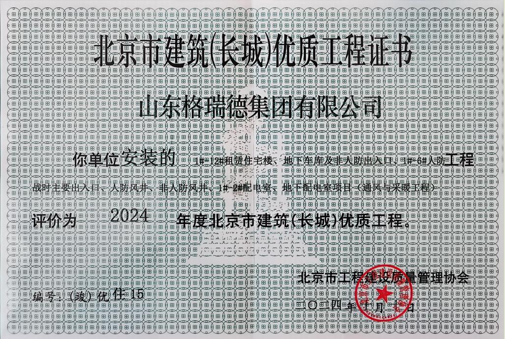 近日,由北京市工程建设资料管理协会下发《关于公示 2024 年度北京市建筑(长城)优质工程名单的通知》。其中山东格瑞德集团有限公司承揽的“ 1#-12#租赁住宅楼、地下车库及非人防出入口、1#-6#人防战时主要出入口、人防风井、非人防风井、1#-2#配电室、地下配电室项目(通风与采暖工程)工程    ”评为2024年度北京市建筑(长城)优质工程。