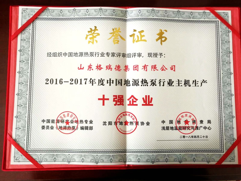 2016-2017年度中国地源热泵行业主机生产十强企业荣誉证书