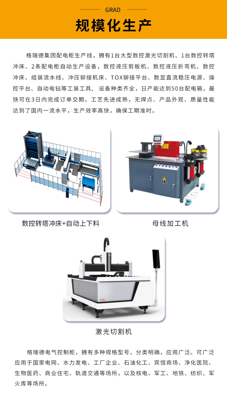 45万平方米的生产基地,20万平方米的高标准生产车间。格瑞德推行GIT准时化生产模式,在此基础上导入了6S管理和TPM全员设备管理理念,促使员工高效完成各项生产任务。