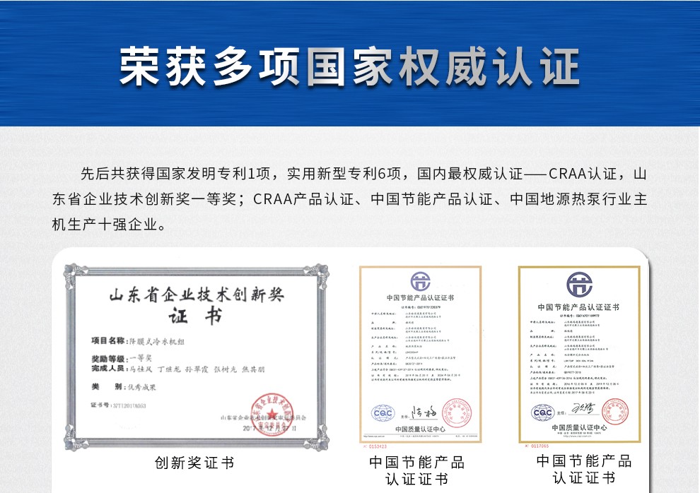 拥有国家机电设备安装壹级资质,环境保护工程二级资质,建筑装修装饰工程专业承包二级资质,钢结构工程三级资质,并获得了中国制冷空调设备维修安装资质,集团生产的空调产品获得国家制冷设备生产许可证,3C中国国家强制性产品认证、CRAA中国制冷空调行业权威性产品性能认证,压力容器国家特种设备设计、制造许可证,制冷主机、风机产品荣获中国节能产品认证。