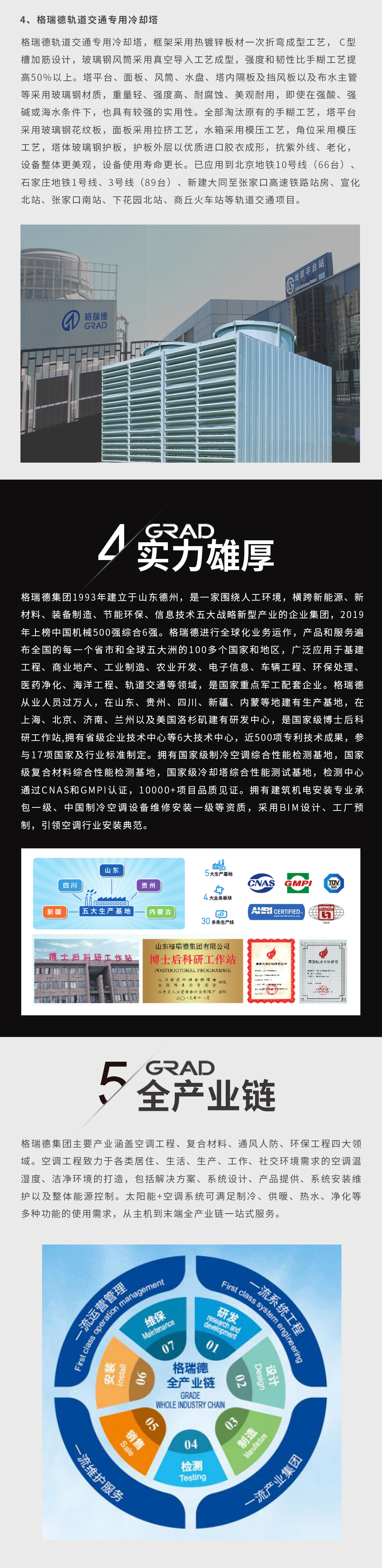 格瑞德致力于让人工环境更美好,通过打造空调工程、通风人防、复合材料、环保工程领域的全过程解决方案来满足客户需求,格瑞德构建了包括品牌规划、系统设计、技术开发、产品制造、整体施工、维护服务、检测认证、人才交流、产业集群的全生命周期产业链和产业生态。