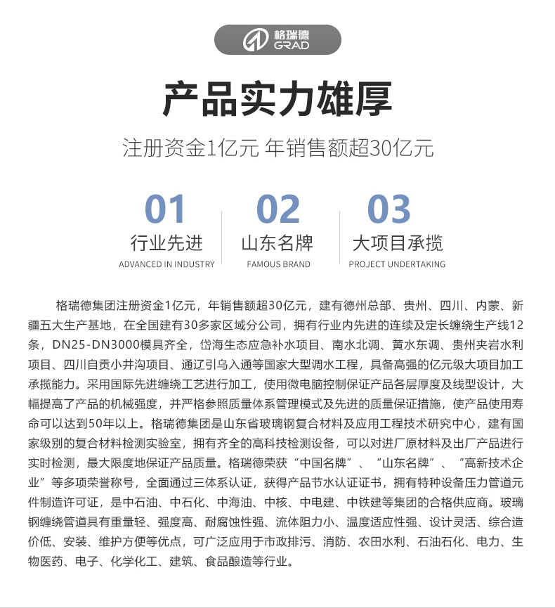 格瑞德1993年建立于山东德州,目前是一家围绕人工环境,横跨新能源、新材料、装备制造、节能环保、信息技术五大战略新型产业的企业集团。格瑞德进行全球化业务运作,产品和服务遍布全国的每一个省市和全球五大洲的100多个国家和地区,广泛应用于基建工程、商业地产、工业制造、农业开发、电子信息、车辆工程、环保处理、医药净化、海洋工程、轨道交通等领域。格瑞德从业人员过万人,在山东、贵州、四川、新疆、内蒙等地建有生产基地,在上海、北京、济南、兰州以及美国洛杉矶建有研发中心。